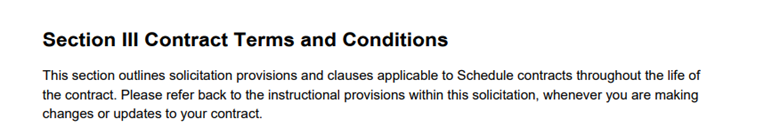 This section highlights the clauses and provisions that are applicable to your contract, including the terms and conditions your business must meet when selling to both federal and commercial customers. Section III B also highlights the components of the contract that may impact order‑level activity. Before submitting an offer, it’s important to read through this section and ensure that you understand all regulations that apply and that your business can continue to meet the terms and conditions throughout the duration of your contract.