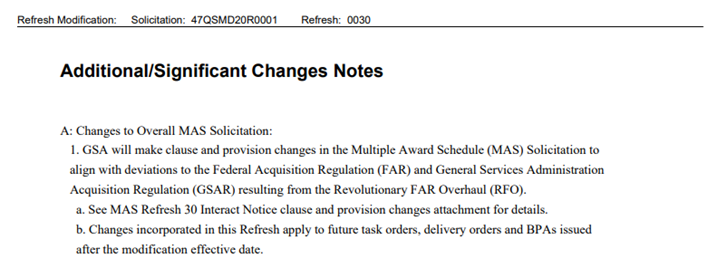 GSA will issue refreshes when there are changes or updates to the MAS Solicitation. The purpose of each refresh is different, but they typically include changes to provisions, clauses, and SINs. When GSA issues a refresh, a Standard Form (SF) - 30 is released to outline significant changes to the solicitation. At the time of this blog, the most recent refresh GSA has released is Refresh #30, which includes significant changes related to the Revolutionary Federal Acquisition Regulation (FAR), or RFO. Additionally, there were changes to ordering procedures and the OLM SIN.
