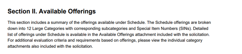 Section II of the Solicitation outlines summaries of available offerings, the structure of offers, and the large categories and sub‑categories. Additionally, this section details Special Item Numbers (SINs) and their corresponding North American Industrial Classification System (NAICS) Codes, critical elements, large‑category‑specific evaluation criteria, SIN‑specific requirements, and ordering criteria. Each Large Category has an individual Solicitation document outlining the specific requirements for the SINs under that category, so it’s best to keep this document handy as a resource related to your offerings.